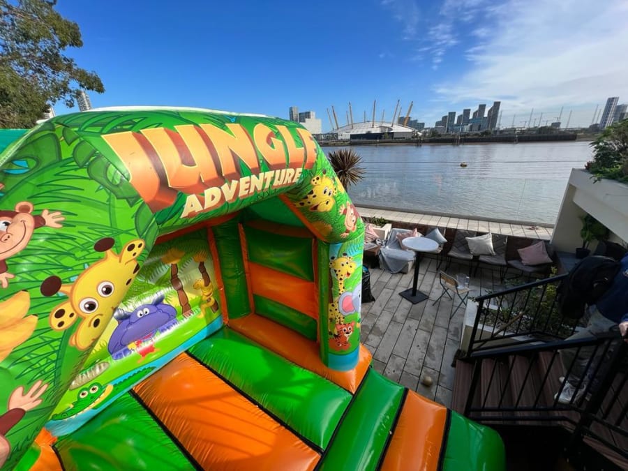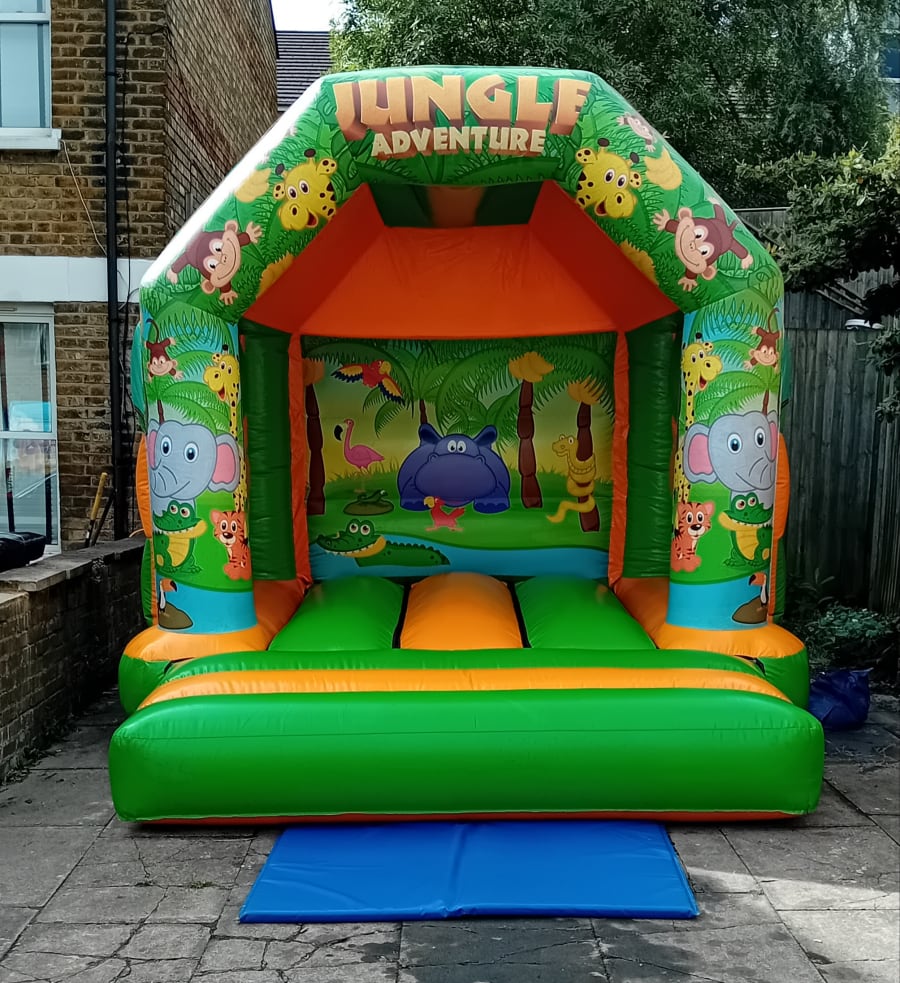 The Jungle bouncy castle is a new edition to our company. It is fun for young children and is very colourful with the main colours being Orange and Green with animals artwork printed all over the castles interior and front columns.