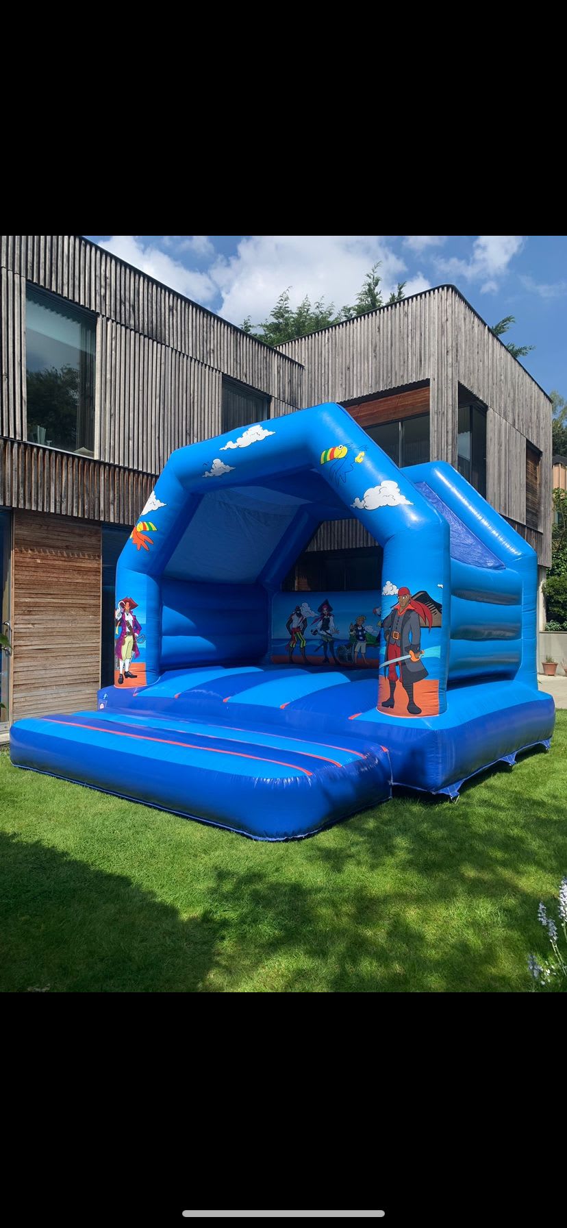 The Pirate Bouncy castle has Pirate themed artwork throughout with a blue background and a large jumping area. The Pirate Bouncy Castle is also suitable for adults.