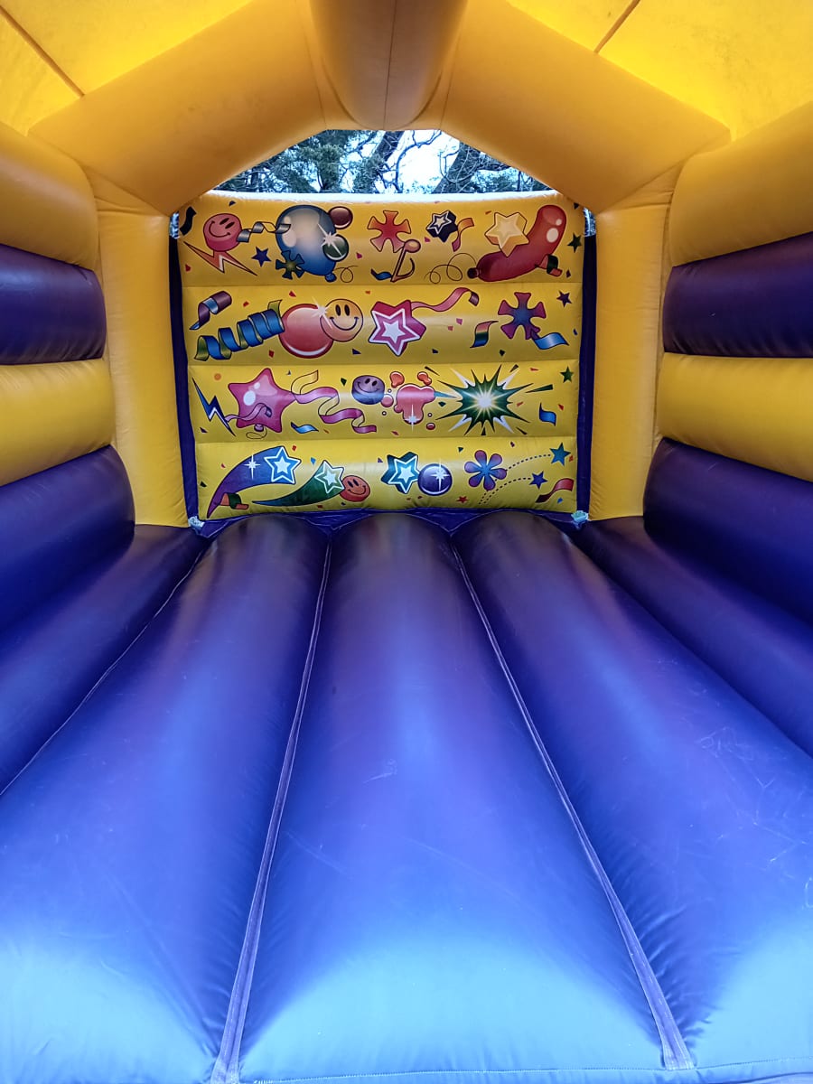 The Adult Castle is suitable for people of all ages and is very popular with adult parties. This castle is Purple and Yellow with ballons and smiling faces as artwork.
