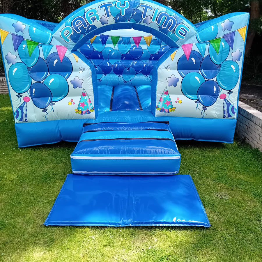 The Blue Celebration bouncy castle is a new edition to our company. It is fun for young children and is low ceiling castle especially made for venues with low ceilings it is 7ft in height and is cloured verious shades of blue with balloon art work on the front of the castle.