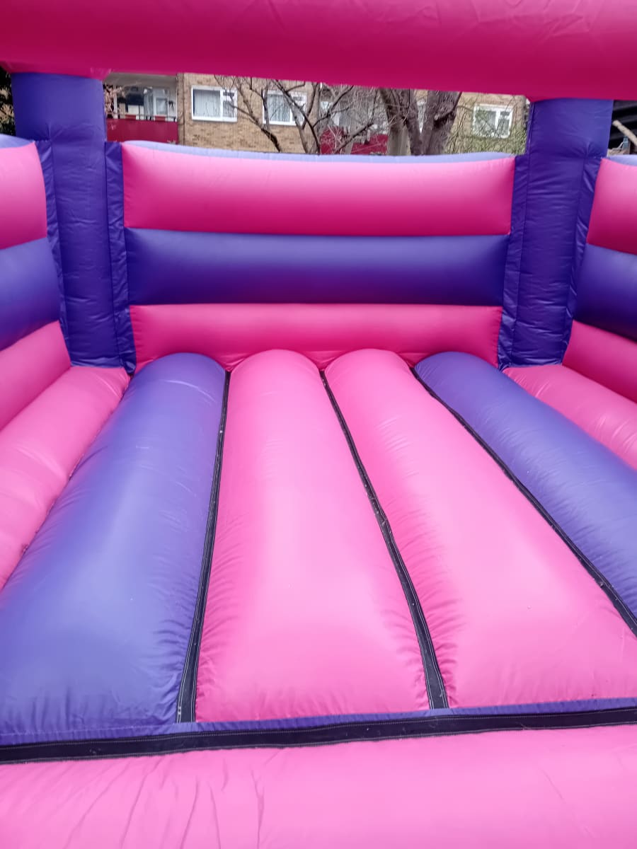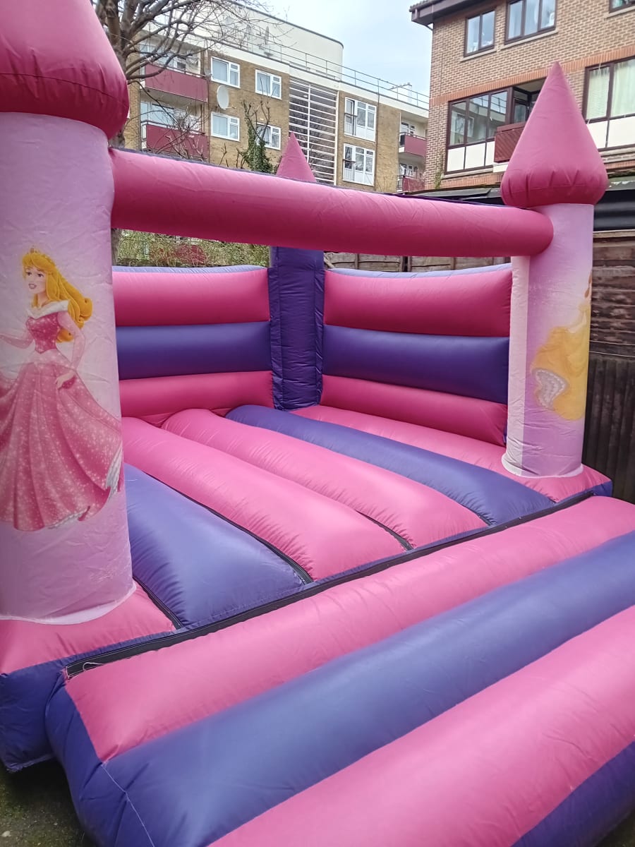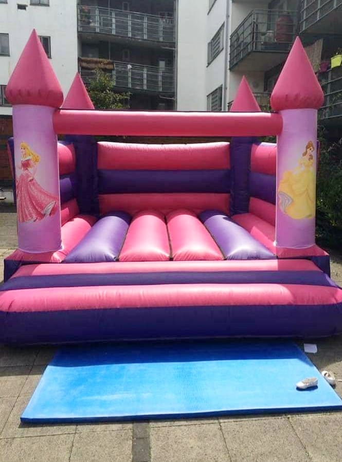 Join Belle and Cinderella in make your bouncy castle hire experience a huge hit. This is a open top pink and purple castle with turrets on each corner of the castle. This castle has 2 princess images on both front turrets.