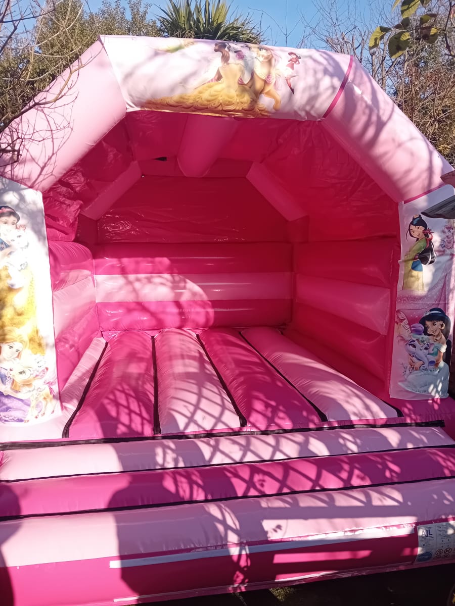 This is a Two toned pink A frame castle with princess artwork on the front it also has a with roof cover.