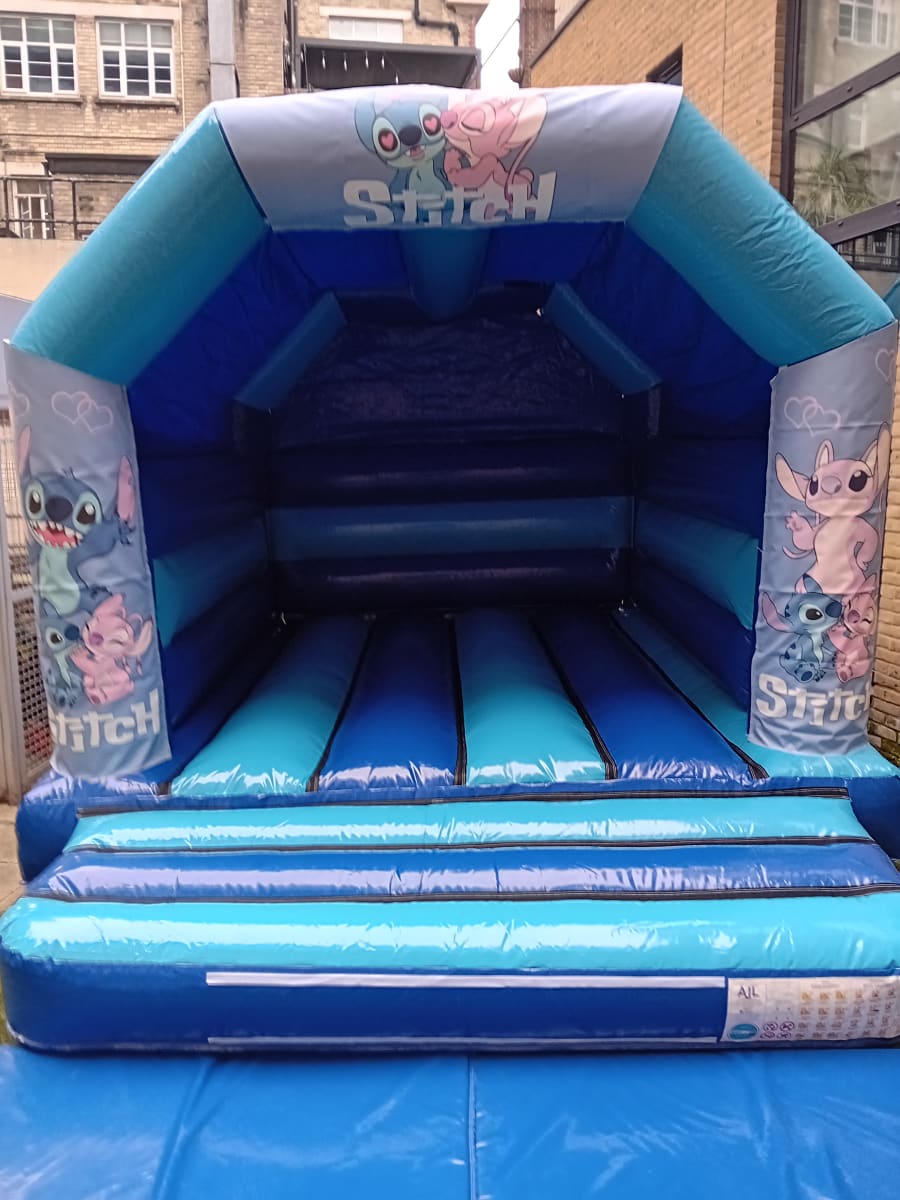 This is a Two toned Blue A frame castle with Lilo and stitch artwork on the front three banners it also has a roof cover.