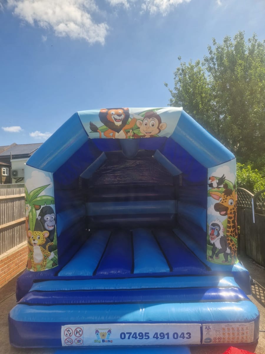 This is a two toned Blue A frame castle with three panel Jungle artwork and a roof cover.