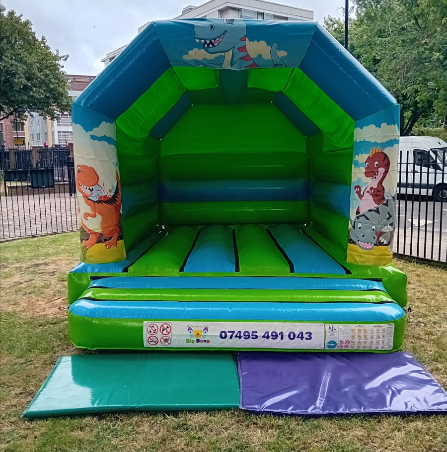This is a Green and Blue Dinosaur A frame castle with three panel Dinosaur artwork and a roof cover.