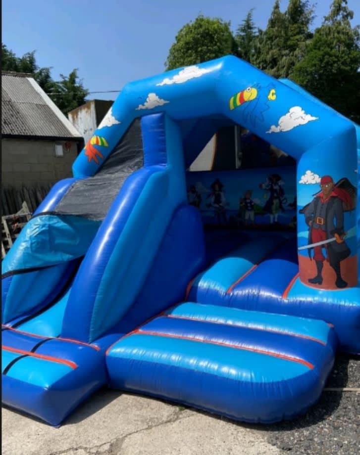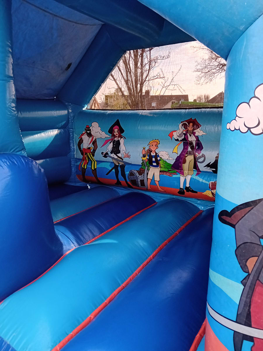 The Pirate Castle comes with a front slide making it more accessible to smaller gardens whilst keeping the same size jumping area of a side slide castle. The Pirate castle has Pirate themed artwork throughout with a blue background. This castle is suitable for children under 7 years old.
