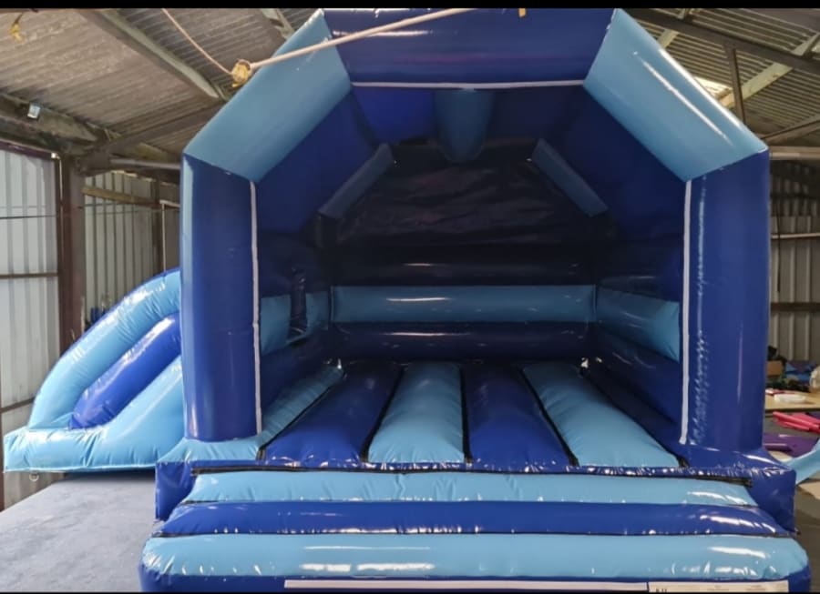 This is a two tone Blue A frame castle with a Side slide and a roof cover.