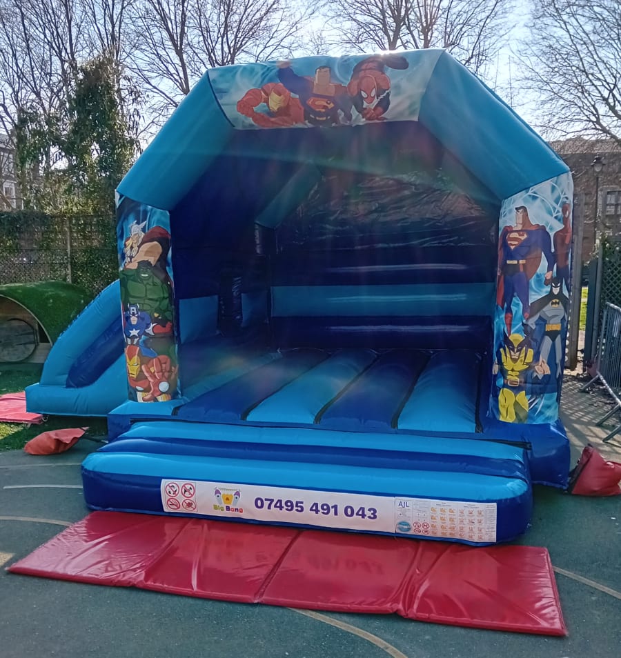 This is a two tone Blue A frame bouncy castle superhero artwork on the front it also comes with a Side slide and a roof cover.