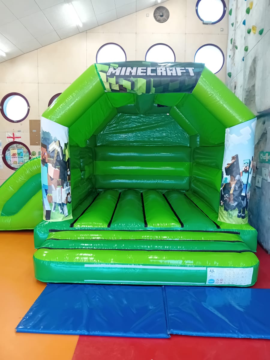 This is a two tone Green A frame castle with Minecraft artwork and a Side slide and a roof cover.