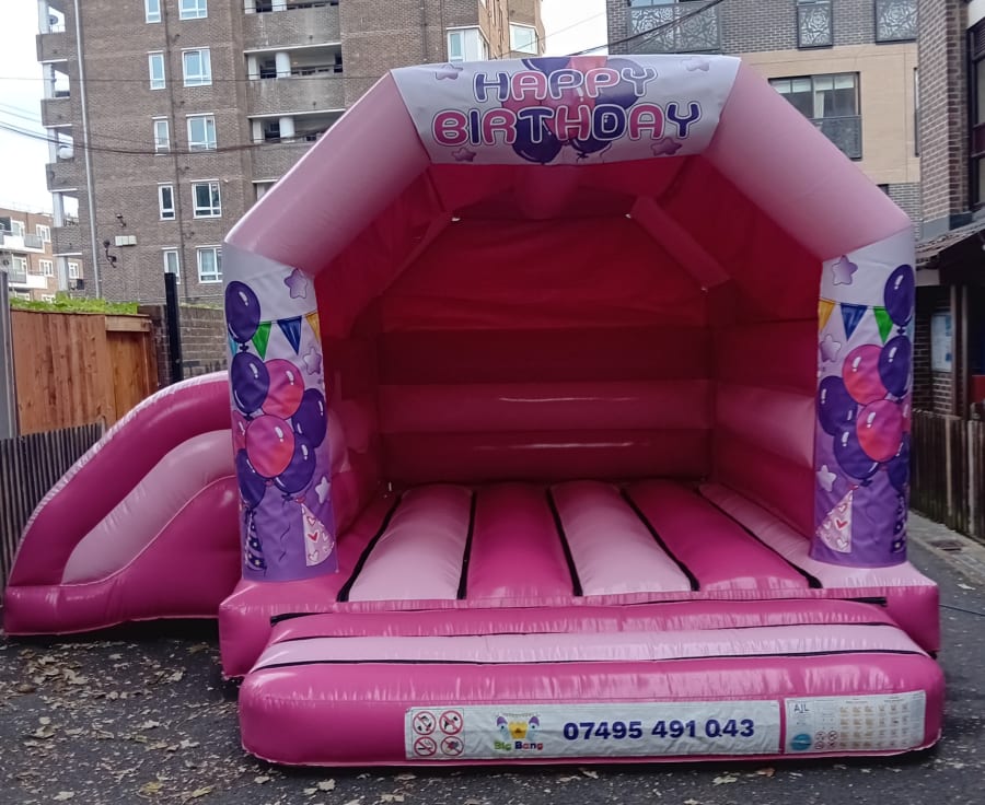 This is a two tone Pink A frame castle with Artwork reading Happy Birthday. Icomes with a Side slide and a roof cover.