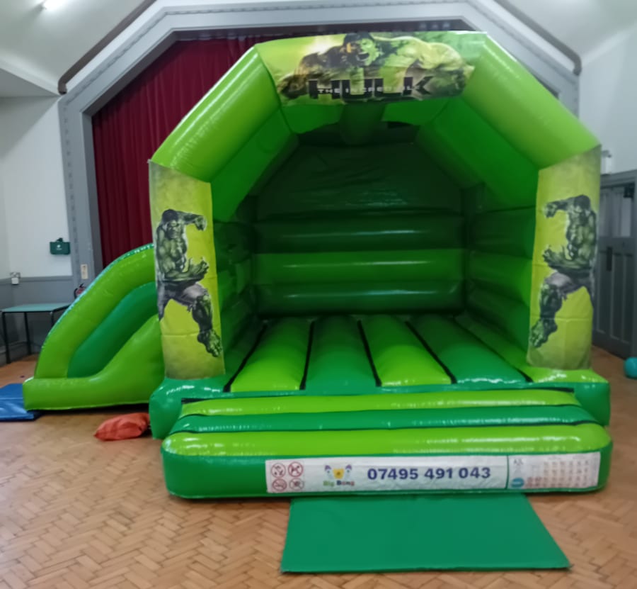 This is a two tone Green A frame castle with Hulk artwork and a Side slide and a roof cover.
