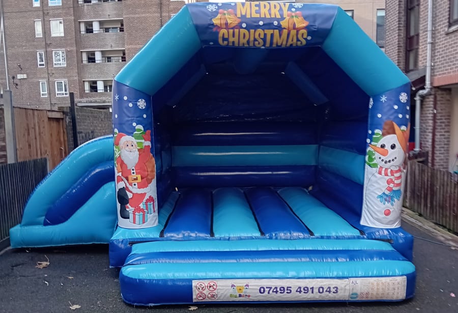 This is a two tone Blue A frame bouncy castle Christmas artwork on the front it also comes with a Side slide and a roof cover.
