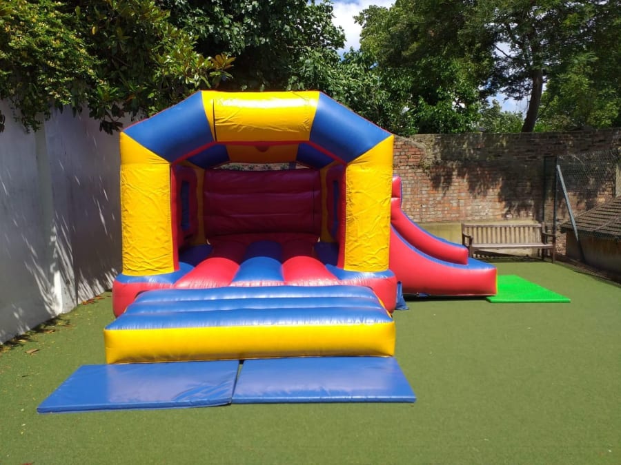 The Yellow Neutral Castle is fun for children of all ages It comes with 4 plain yellow Velcro banners and has an interchangeable slide that can be attached to either side of the bouncy castle.