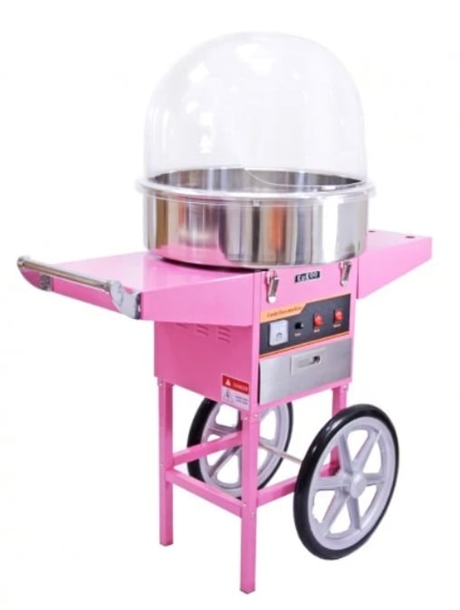 This Candy Floss Machine comes with a cart with wheels and a plastic cover. This Candy Floss Machine can be booked without the cart and cover prices will vary on how you would like it set up.