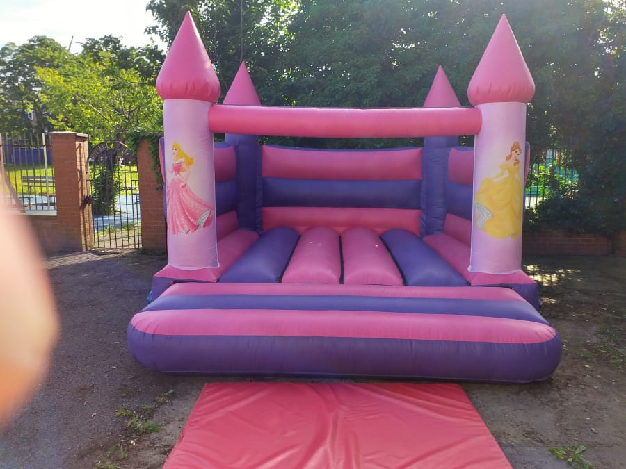 Join Belle and Cinderella in make your bouncy castle hire experience a huge hit. This is a open top pink and purple castle with turrets on each corner of the castle. This castle has 2 princess images on both front turrets.