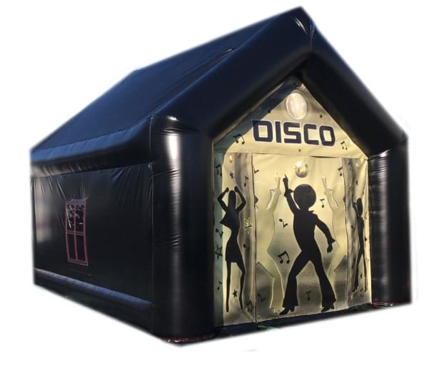 Our inflatable Disco Marquee is enclosable. It is a black unit with disco logos on the front panel